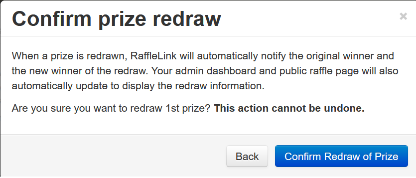 When a prize is redrawn, RaffleLink sends an automated email to the original prize winner and the redrawn winner notifying them of the redraw occurring. The Raffle Winners tab and the public raffle page will also both update, explaining the prize has been redrawn and showing both winners. The redraw action cannot be undone.