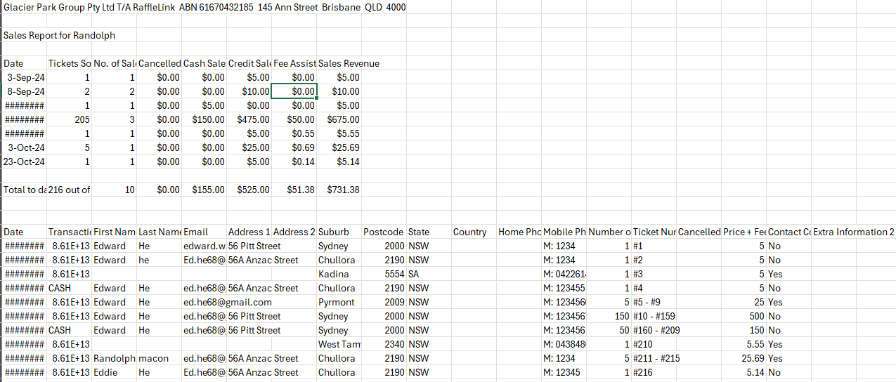 *Note: In the example image, you can see transactions ranging from single tickets (#1-#4) to larger purchases (#10-#159), with varying amounts of fee assistance and contact consent preferences.*